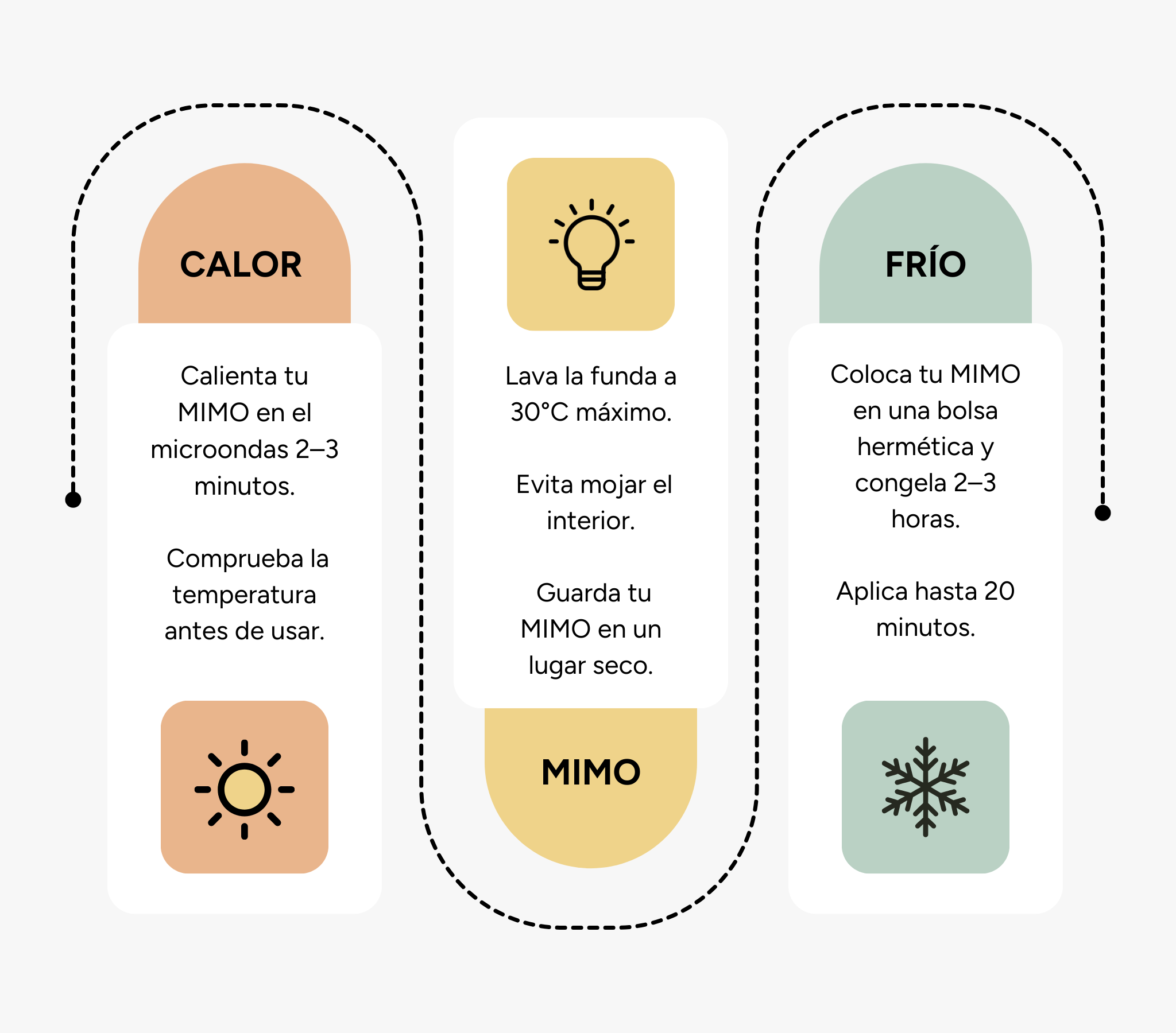 - En caliente, MIMO alivia dolores musculares, cólicos menstruales, lumbalgia, contracturas y tensión cervical.